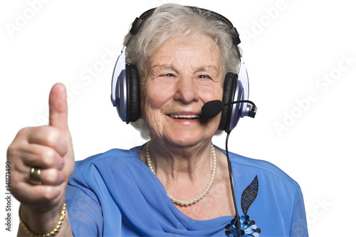Lustige Seniorin über 80 mit Head Set zeigt Daumen hoch - Freisteller - Buy this stock photo and explore similar images at Adobe Stock | Adobe Stock
